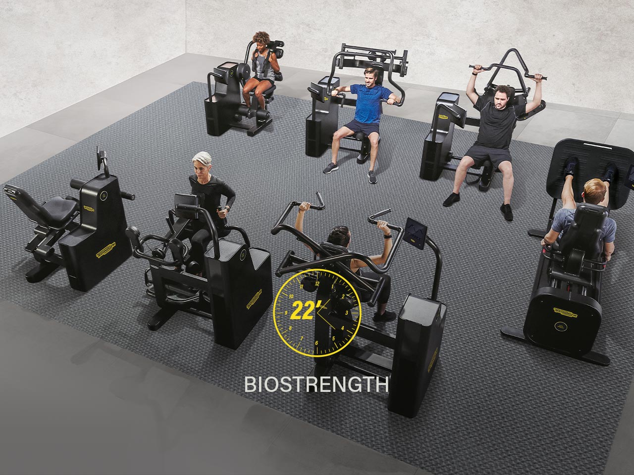 12 тренажёров: 6 Biocardio + 6 Biostrength | Площадь пола: 63,6 кв.м., диаметр: 9 м